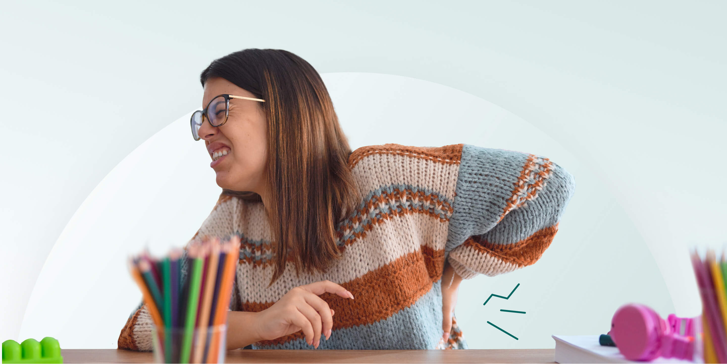 The connection between the classroom and the development of these issues is clear. Prolonged standing and/or sitting, repeated kneeling and stooping, awkward posture, and high workload are all known contributors to the muscle and joint conditions teachers experience. Other risk factors include female gender, age, smoking, and obesity (Abdulmonem 2014).